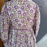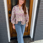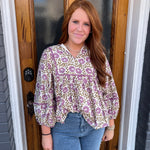 Embrace the changing season with The Chandler Blouse in Purple Mix. Featuring elegant 3/4 balloon sleeves and a flattering collar with a V neckline, this blouse is detailed with a unique square ric rac trim around the front and back bust. The cream background adorned with purple florals and green leaves brings a fresh, nature-inspired look perfect for transitioning into fall. Stylish and comfortable, it’s an effortless way to refresh your wardrobe with seasonal charm.