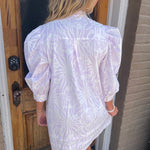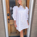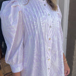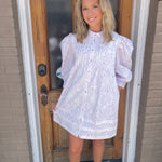 Captivate in THE CHARLESTON DRESS, a lavender and off-white mini featuring delicate pintuck detailing and a subtle floral print. This elegant button-down design effortlessly transitions from day to evening, promising both sophistication and style with every wear.
