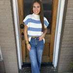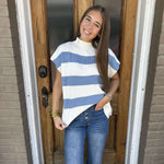 Transform your summer wardrobe with The Charlotte Top—a perfect blend of comfort and style featuring denim blue and off-white stripes. This oversized, short-sleeve design offers the cozy look of a sweater with lightweight breathability ideal for warm days. Make a trendy statement without sacrificing comfort in this must-have seasonal essential.