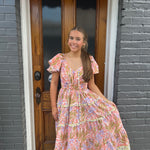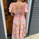 Elevate your wardrobe with The Claire Dress in vibrant coral pink. Featuring a flattering V-neckline with a delicate tie, dramatic floral ruffle sleeves, and a smocked waist that enhances your silhouette, this midi dress blends comfort with elegance. The tiered skirt adds movement and charm, perfect for warm days and special occasions. Lightweight and unlined, it offers breathability and effortless style wherever you go.