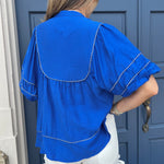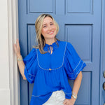 Indulge in the effortless style and comfort of THE EASY BREEZY BLOUSE. Its relaxed, breezy fit and layered ruffle sleeves offer a chic and stylish look. The split neckline with tie accents adds a touch of femininity, while the lightweight and airy fabric ensures all-day comfort. Don't miss out on this must-have addition to your wardrobe!