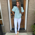 Indulge in the modern yet classic style of THE JULIETTE TOP BY ADRIENNE. This gorgeous top features a front tie peplum design, highlighting your figure while offering a trendy twist. The ruffle bubble sleeves add a touch of charm and playfulness, making it a must-have for any fashion-forward wardrobe. The stunning green pop stripe print adds a pop of color and pattern to complete your look. Elevate your style with THE JULIETTE TOP!