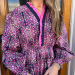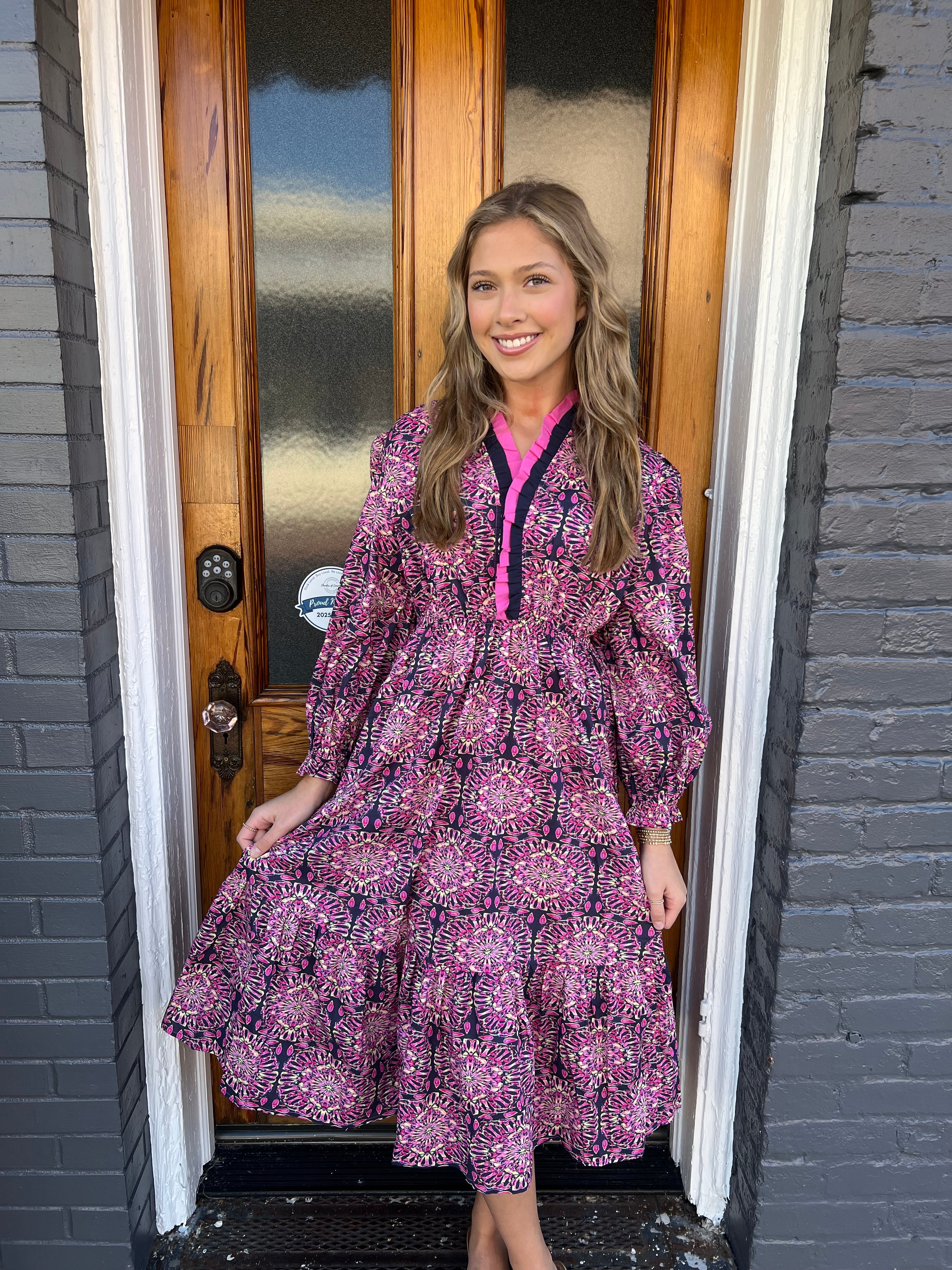 Embrace timeless elegance with THE KALEIDOSCOPE PRINT DRESS in Navy. This midi dress features a captivating two-tone kaleidoscope print that brings subtle artistry to your wardrobe. The smocked elastic waist flatters your figure while providing comfort, complemented by a V-neckline and long balloon sleeves for a graceful silhouette. Pleated trims and a tiered hem with ruffle details add feminine charm, making it perfect for both casual outings and special occasions. Lightweight and unlined, it offers a breezy feel ideal for any season. Elevate your style effortlessly with this standout piece.