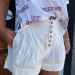 Elevate your summer wardrobe with The Katlyn Shorts in White. These solid shorts feature a stylish exposed button fly and tiered seaming for a modern touch. Designed with two side pockets and a back elasticized waistband, they offer both convenience and comfort. The relaxed fit ensures ease of movement, making them perfect for casual outings or warm days. Experience effortless style and comfort with these versatile shorts.