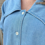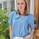 Elevate your wardrobe with THE KRISTI TOP. This denim short sleeve top features a chic elasticated sleeve and a wide chelsea collar, adding a touch of sophistication to any outfit. With its front button closure and non-sheer, lightweight fabric, this top is both stylish and comfortable. Upgrade your style game with THE KRISTI TOP today!