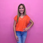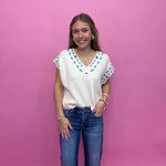 Introducing the Laura Top, your new go-to for effortless style. This short sleeve knit top features a flattering v-neck and delicate detailing around the neckline and arms. Elevate your wardrobe with this versatile and stylish piece.