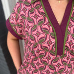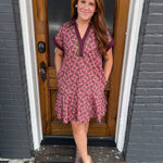 Elevate your style with The Magan Dress in Wine, featuring a captivating abstract pattern and playful flounce ruffle hem. This lightweight woven mini dress showcases a chic contrast accent spread collar and convenient side pockets, blending fashion with function effortlessly. Fully lined and non-sheer, it offers comfortable coverage for any occasion.