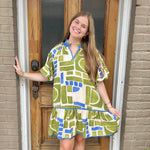 This dress is a striking addition to any wardrobe! With its allover abstract geometric print and v-neckline featuring contrast piping, it's a unique and eye-catching piece. The short puff sleeves and drop waist with ruffle hem add a touch of feminine charm. Not lined.