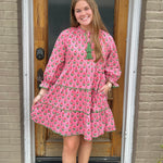 Introducing THE SARAH DRESS - a floral print mini dress that effortlessly combines style and comfort. Designed with an elasticated ¾ sleeve and tiered silhouette, it features an accented scallop trim inset and side pockets for added convenience. This lightweight and non-sheer dress is lined for a flawless fit. Make a statement with THE SARAH DRESS!