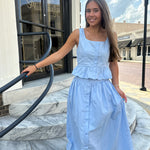 Dress to impress in THE SKIES ARE BLUE SET! This elegant set includes a sleeveless peplum top with a square neckline and a long skirt featuring nonfunctional buttons and concealed zipper closures for a chic and fashionable look. Perfect for any occasion, this set will elevate your style game and make you stand out in a crowd.