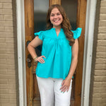 The Tiffany Top is a must-have for any fashion-forward wardrobe. Featuring solid short flutter sleeves and a round yoke with ruffle details, this poplin blouse is both chic and feminine. Available in a beautiful aqua marine color, it's perfect for adding a touch of color and flair to any outfit.