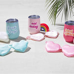 Introducing our WINE RELAX GIFT SET - your perfect companion for a relaxing night in. This 3-piece set includes a stainless steel travel tumbler and lid, a heart sleep mask, and your choice of a heart, cloud, or rainbow stress ball. Unwind and recharge with this ultimate gift set.