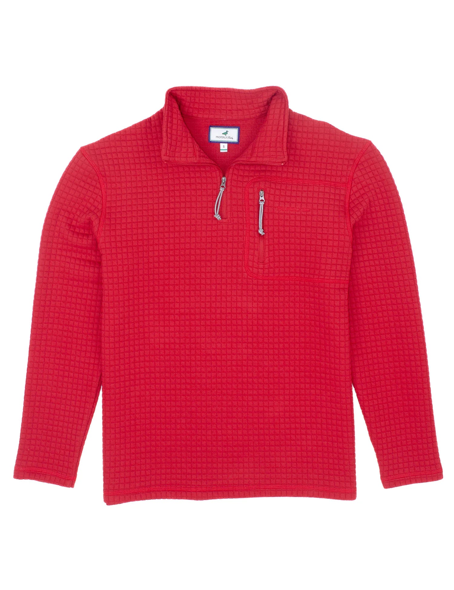 Elevate your style with the Boys Delta Pullover from Properly Tied in True Red. This midweight layer features a quarter-zip design and a chest pocket with a zipper, offering both fashion and practicality. Whether you're out adventuring or relaxing, the Delta Pullover keeps you effortlessly cool and comfortable.