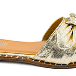 Elevate your everyday style with the Clam Bake sandal in shimmering gold crinkle metallic. This slip-on slide features a soft metallic upper with an eye-catching knotted detail at the center, creating an effortlessly chic focal point. Delicate metallic studs accent the sole's edge, adding a modern, fashion-forward touch.