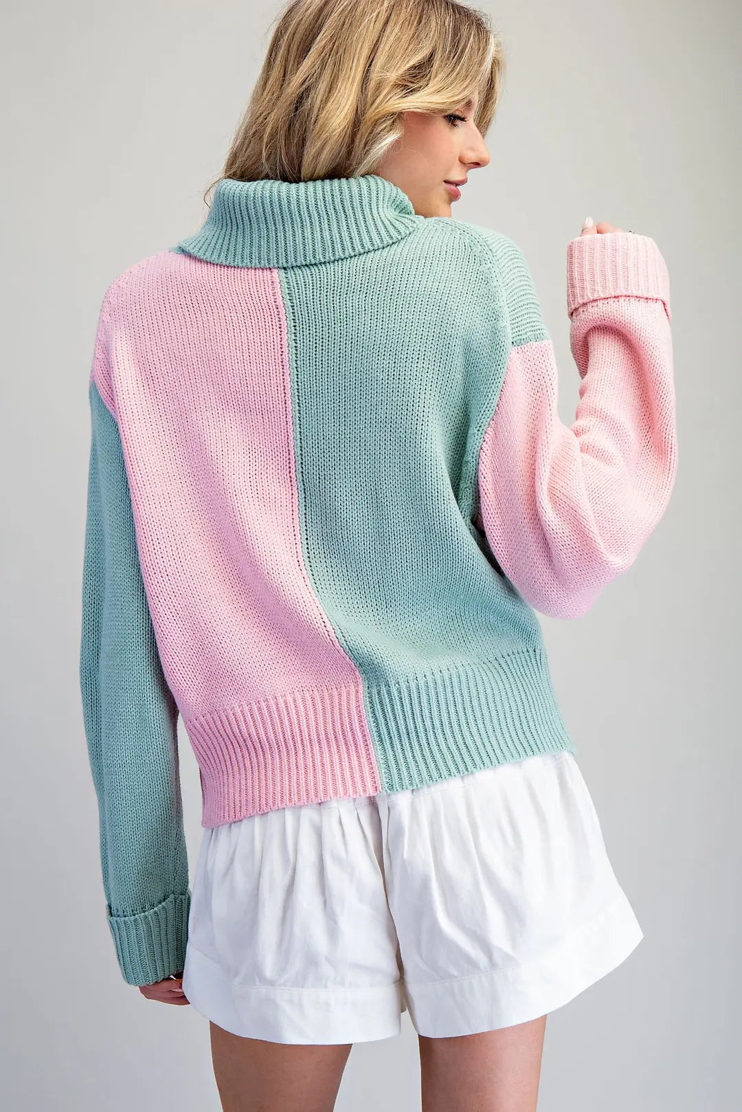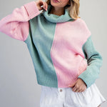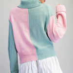 Elevate your everyday wardrobe with this striking colorblock turtleneck sweater. The mint and pink color combination creates a modern, eye-catching look that effortlessly transitions from casual outings to relaxed office settings. Crafted from soft knit fabric, this long-sleeve top features a cozy ribbed turtleneck, reinforced ribbed cuffs, and a ribbed hem for a polished finish. The relaxed fit body provides comfortable all-day wear without sacrificing style. Perfect for layering or wearing solo, this versatile piece is a must-have addition to any contemporary wardrobe.
