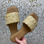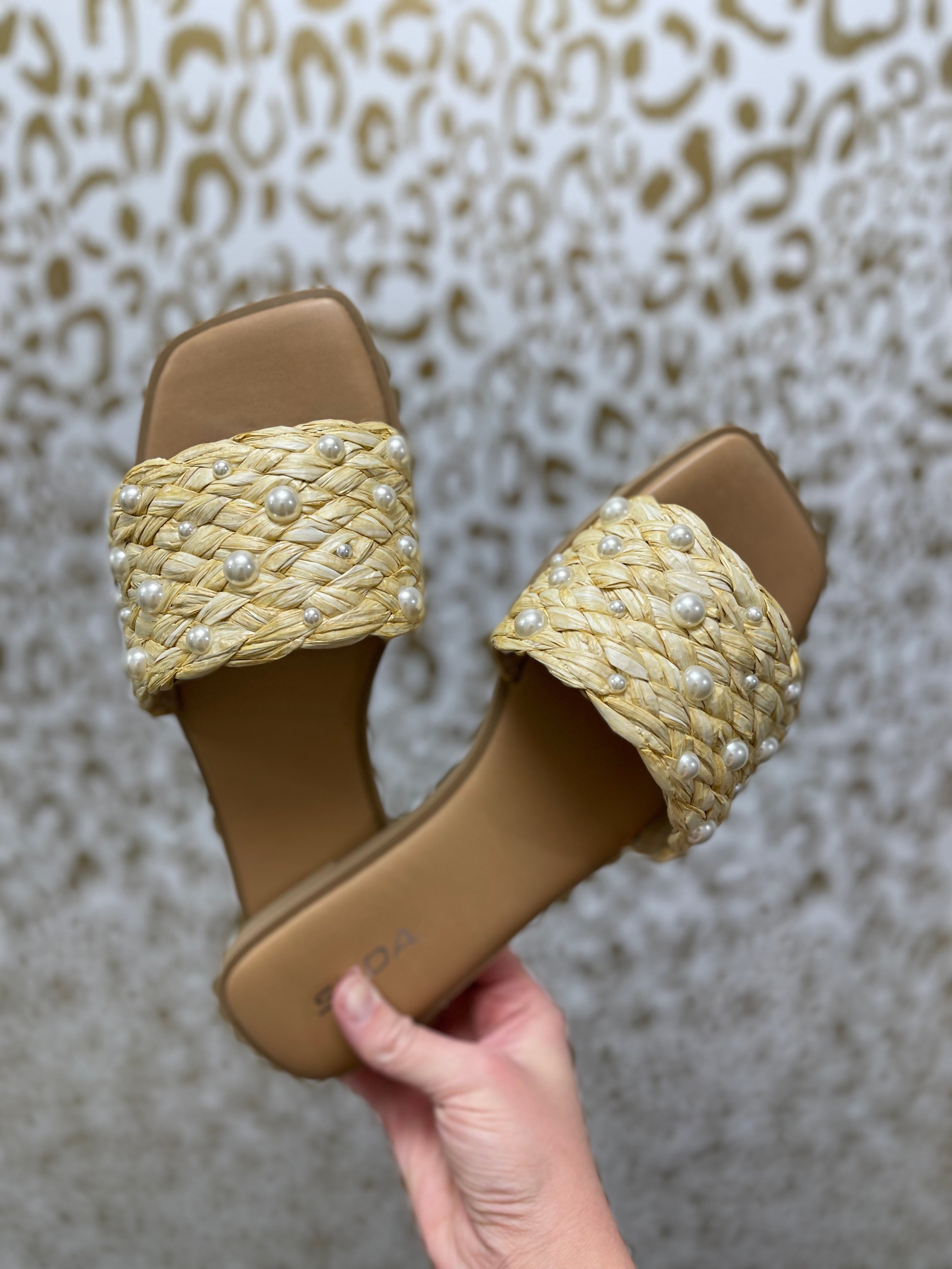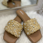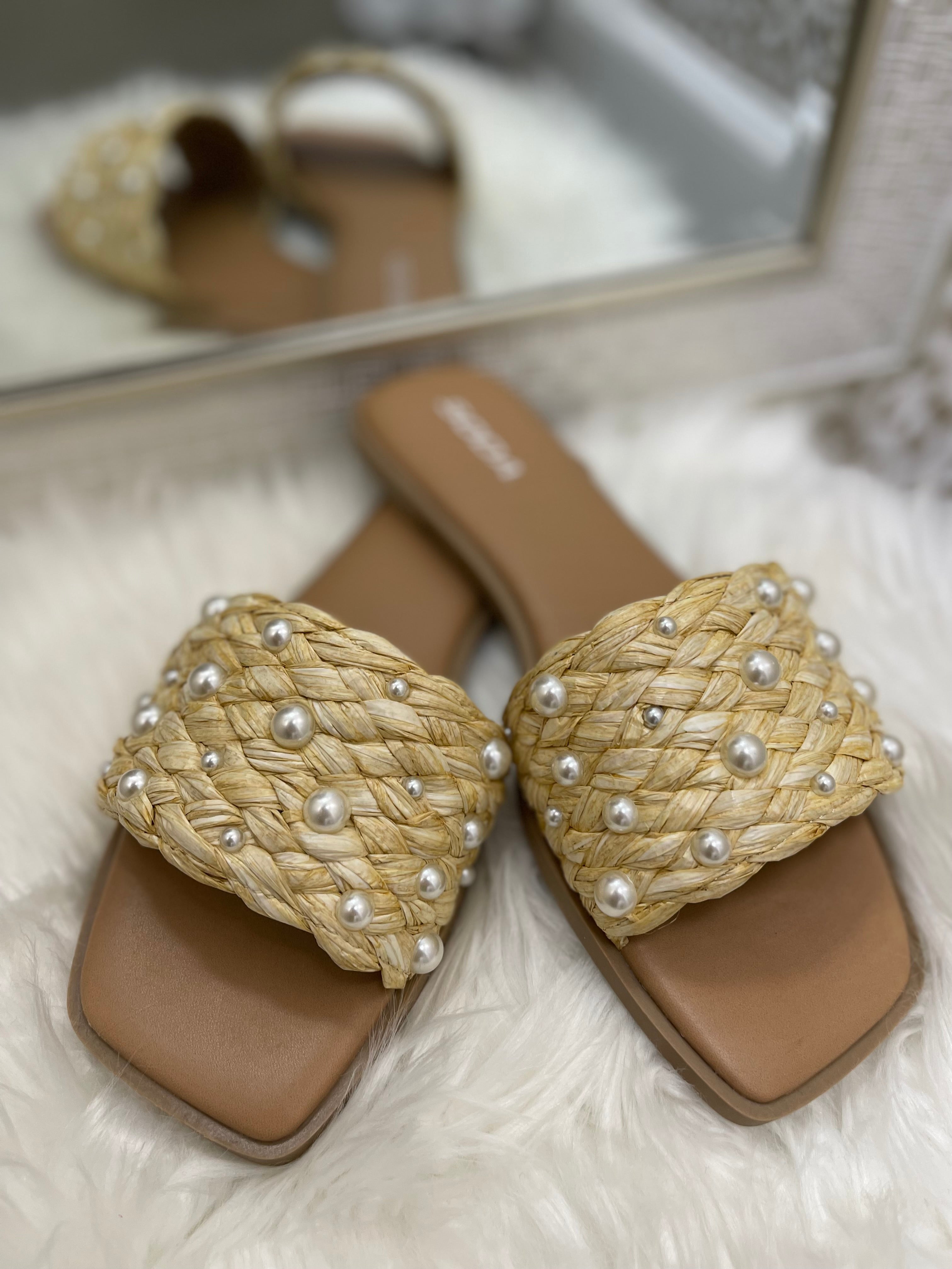 Experience elegance and comfort with ENGINE PEARL SLIDE - the perfect sandal for any occasion. Crafted with a raffia upper design and adorned with multi-size pearl embellishments, this slip-on style sandal features a square-toe and lightly padded insole for added support. Complete with a rubber outsole and a .75 inch heel height, these slides will elevate any outfit with a touch of sophistication.