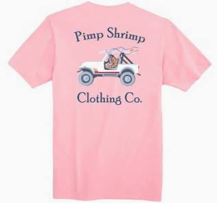 The "Pimp Shrimp OFF ROAD" Pocket Tee in pink offers a relaxed fit and soft, 100% organic cotton for comfort. Tagless design prevents irritation. Easy care: machine wash cold, tumble dry low.