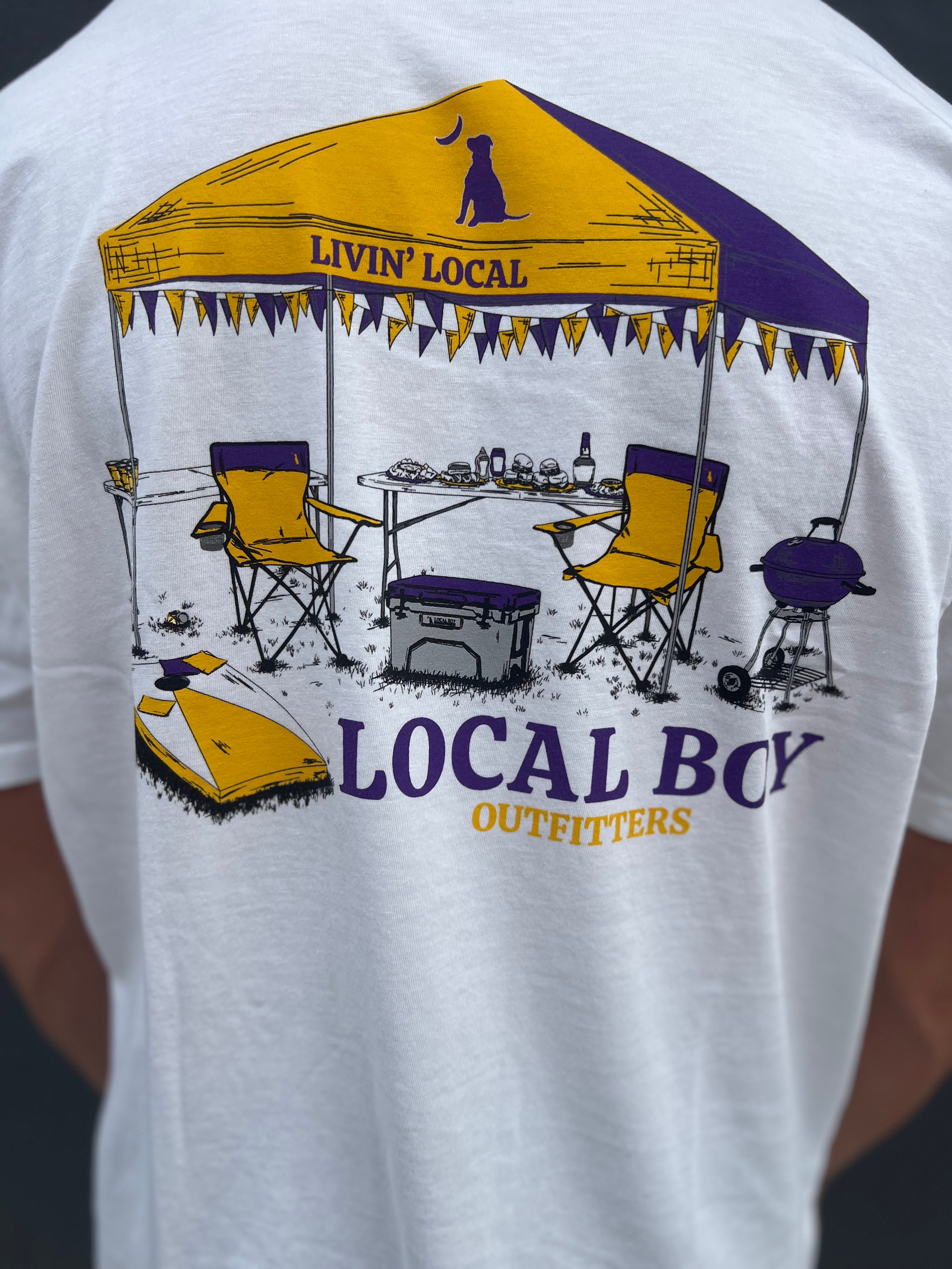 Celebrate your school pride with the Tailgate Scene Short Sleeve Tee in striking yellow, purple and white. Featuring a vivid tailgate illustration of a tent and chairs in your school colors, this tee perfectly blends comfort with spirited style. Whether cheering from the sidelines or enjoying the pre-game festivities, show your enthusiasm and tailgate in confidence. Crafted for a relaxed fit, it’s an ideal choice for game day and beyond.