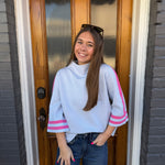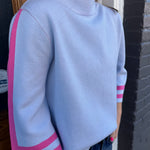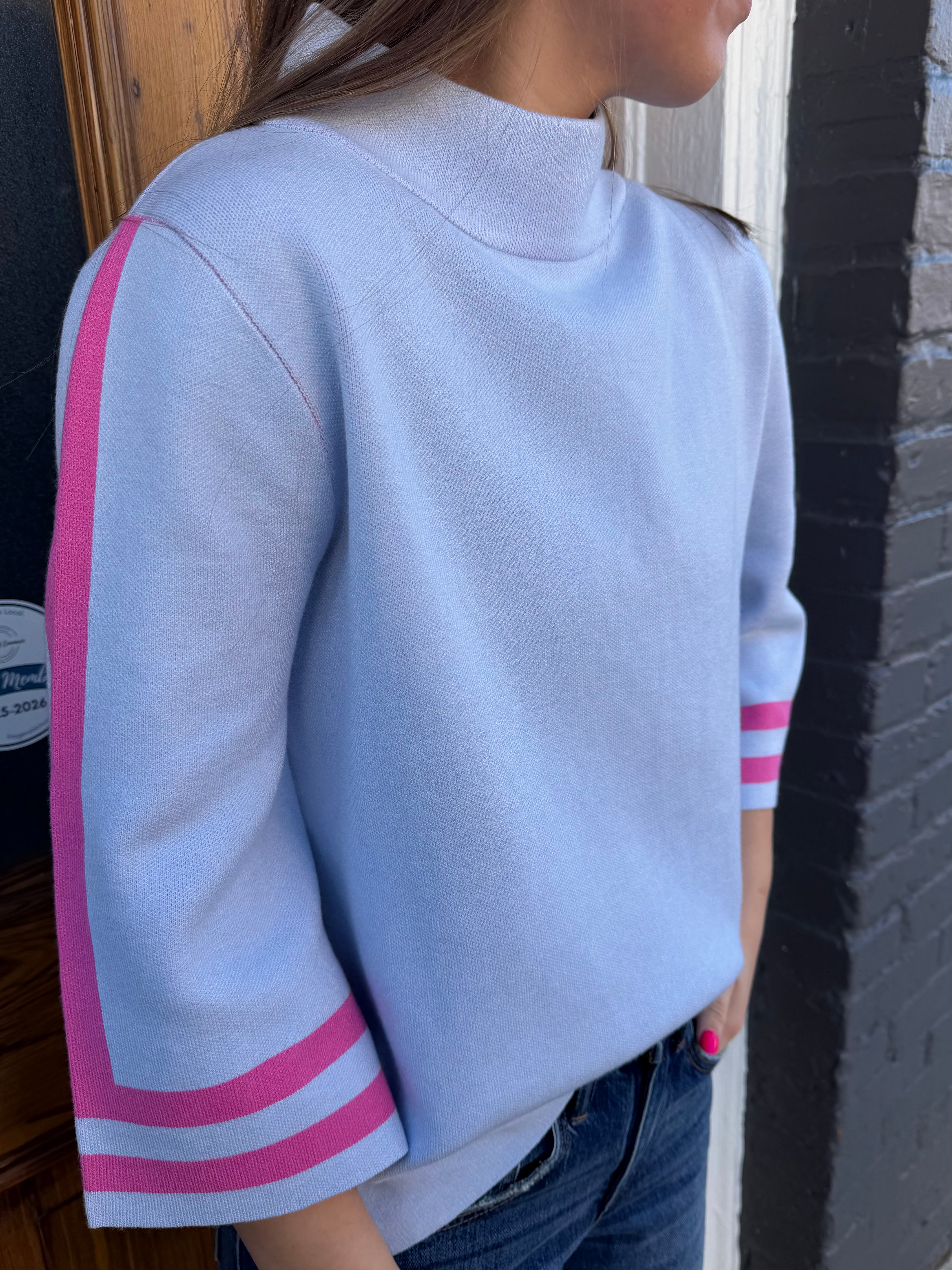 The Allison Sweater in Powder Blue is your go-to layering piece for effortless style. This mock neck top features refined striped detailing along the sleeves and arm trim for subtle visual interest. Crafted from a luxurious blend of 55% viscose and 45% nylon, it delivers an incredibly soft, sumptuous feel against your skin. The thoughtfully balanced weight makes it ideal for transitional weather—substantial enough to keep you comfortable on cooler days, yet breathable enough for layering. Whether dressed up or down, this sweater combines comfort with understated elegance.