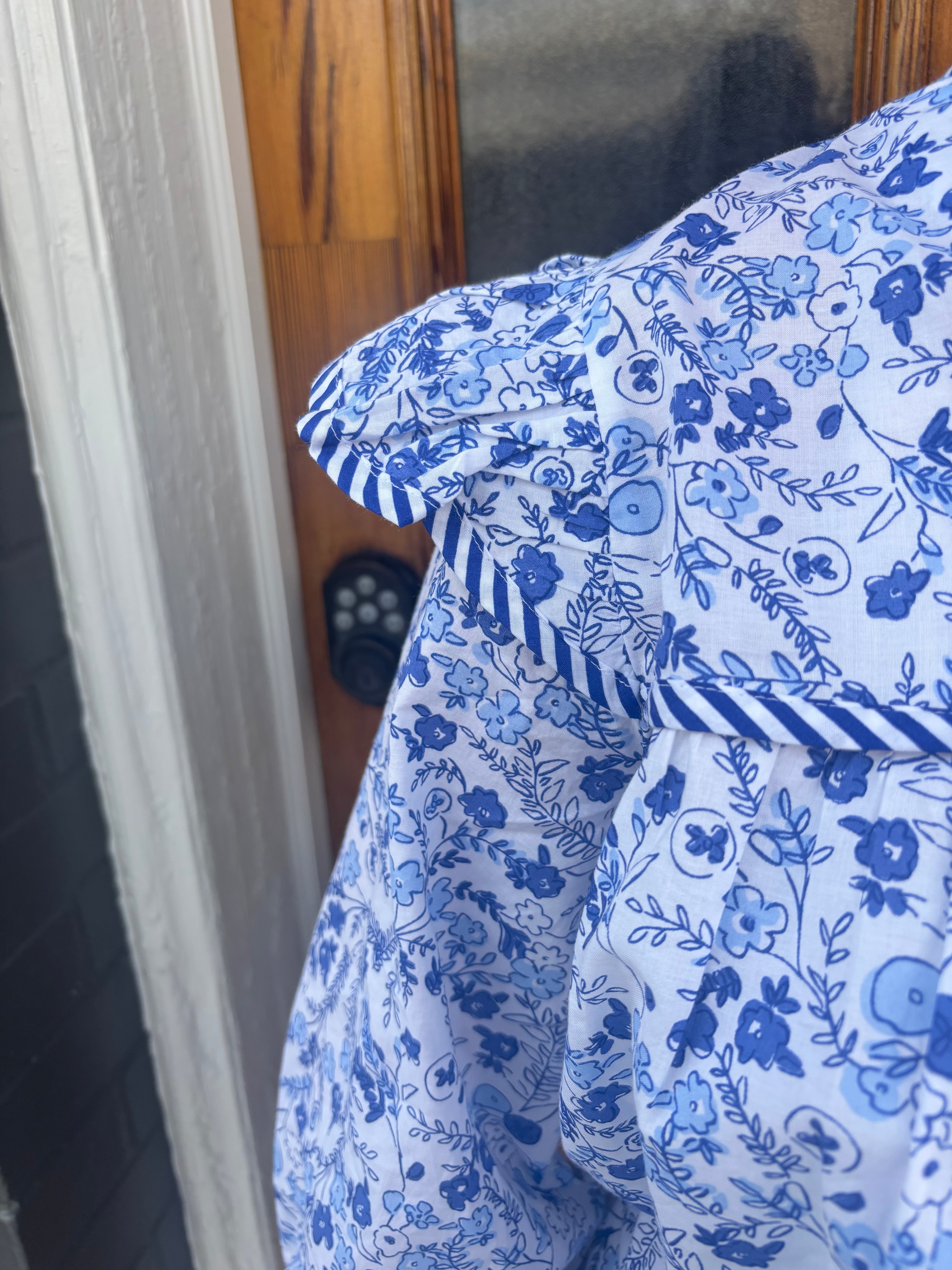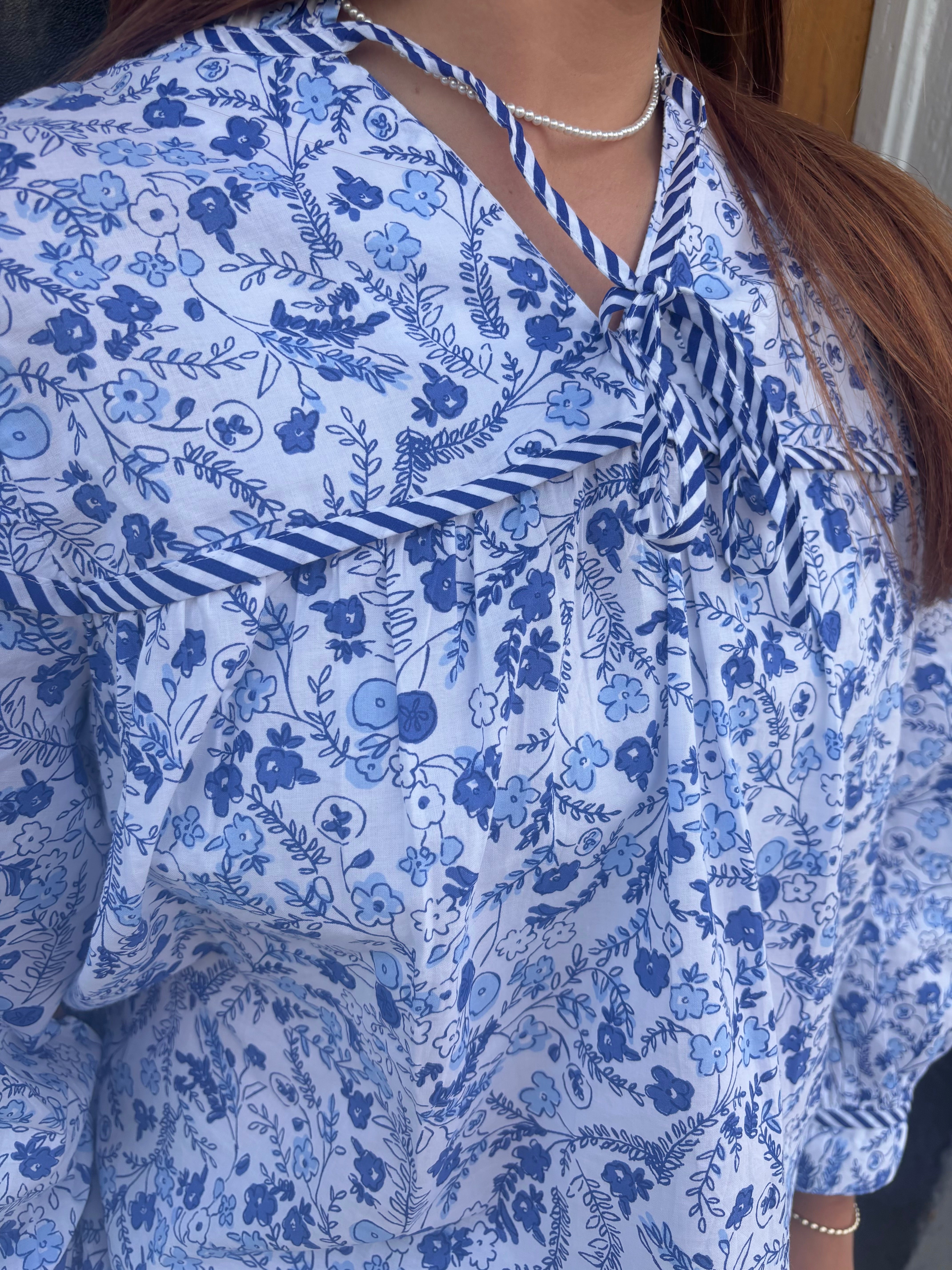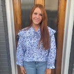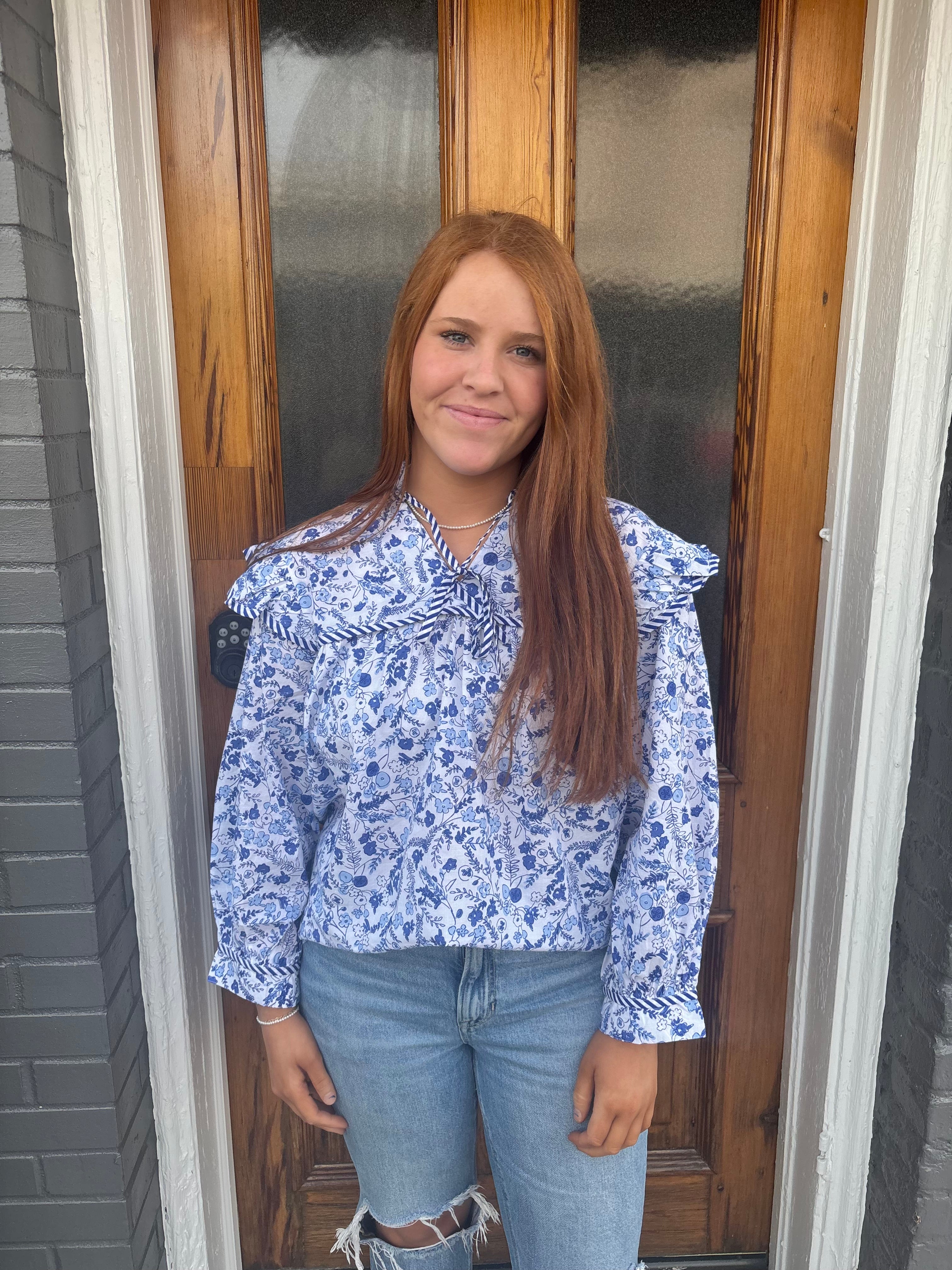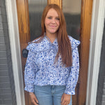 The Beaufort Top brings effortless charm with its playful mix of textures and tones. Featuring a relaxed pull-over silhouette in white with tonal blues, this beauty showcases a flattering V-neck with a contrasting tie closure and delicate ruffles at the neckline and sleeve caps. The three-quarter sleeves button at the cuff for easy styling versatility. Perfect for layering or wearing solo, it's a wardrobe essential that feels both put-together and wonderfully carefree.