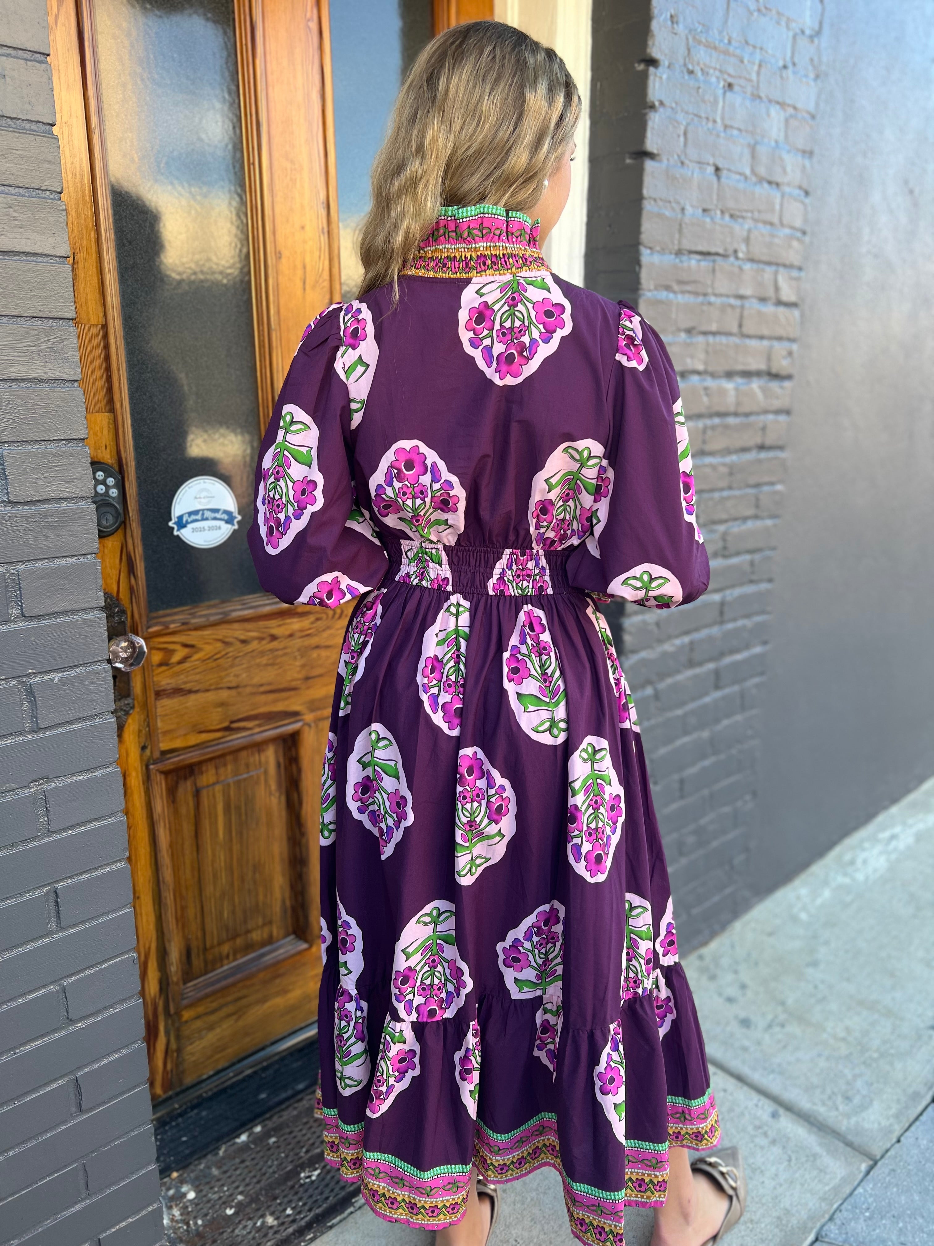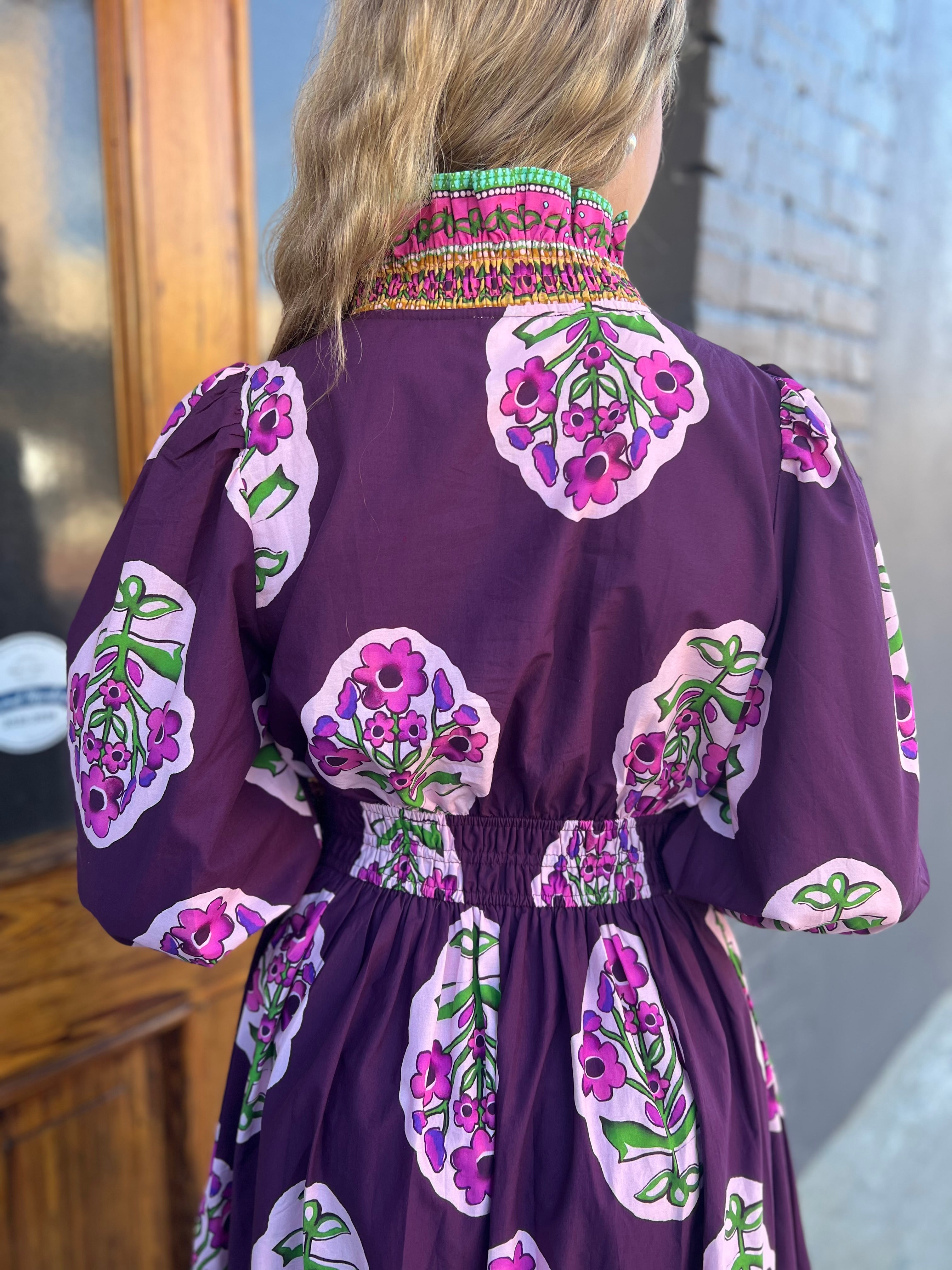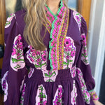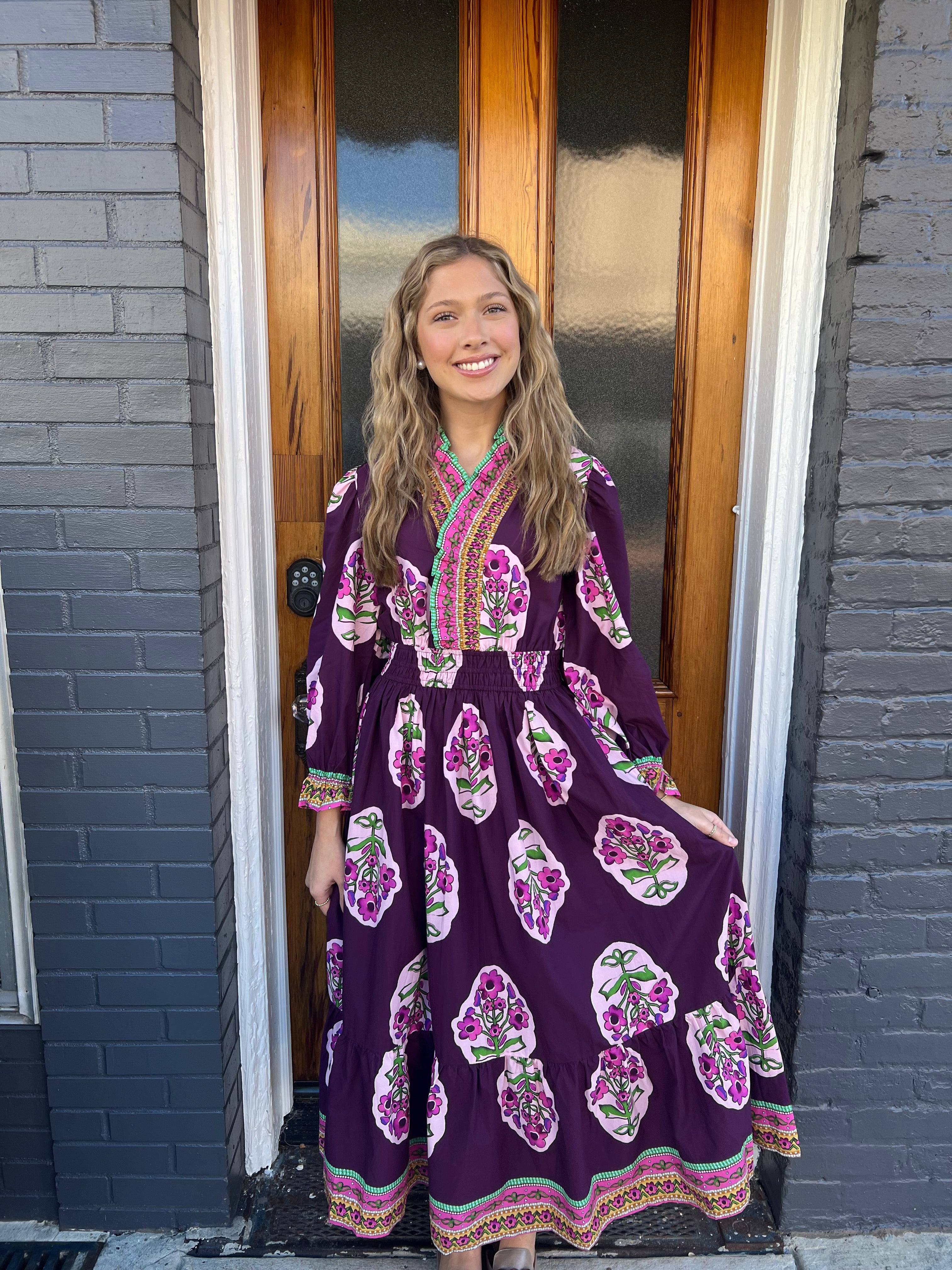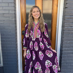Embrace effortless elegance with the Belinda Dress in Plum Mix. This boho floral maxi features a flattering deep V-neck highlighted by a delicate ruffle trim. Long puff sleeves with smocked cuffs add romantic volume, while the smocked elastic waist defines your silhouette comfortably. Perfect for any occasion, this dress flows gracefully without lining, keeping you light and stylish all day or night.