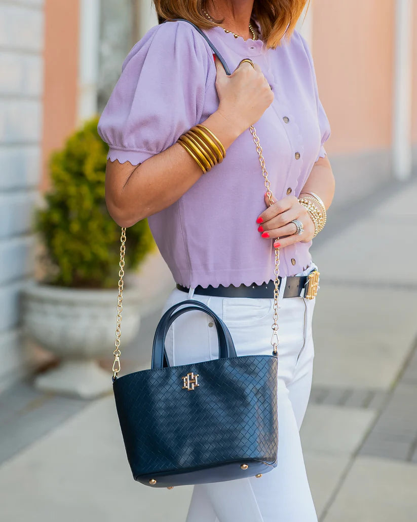 The Maren Mini Tote combines charm with practicality in a compact woven design. This adorable bag features a secure magnetic closure to keep your essentials safe, paired with sturdy handles for easy carrying. Switch between hand and shoulder wear with the removable chain strap, while protective feet on the bottom keep the bag looking pristine. Perfect for everyday outings or special occasions.