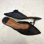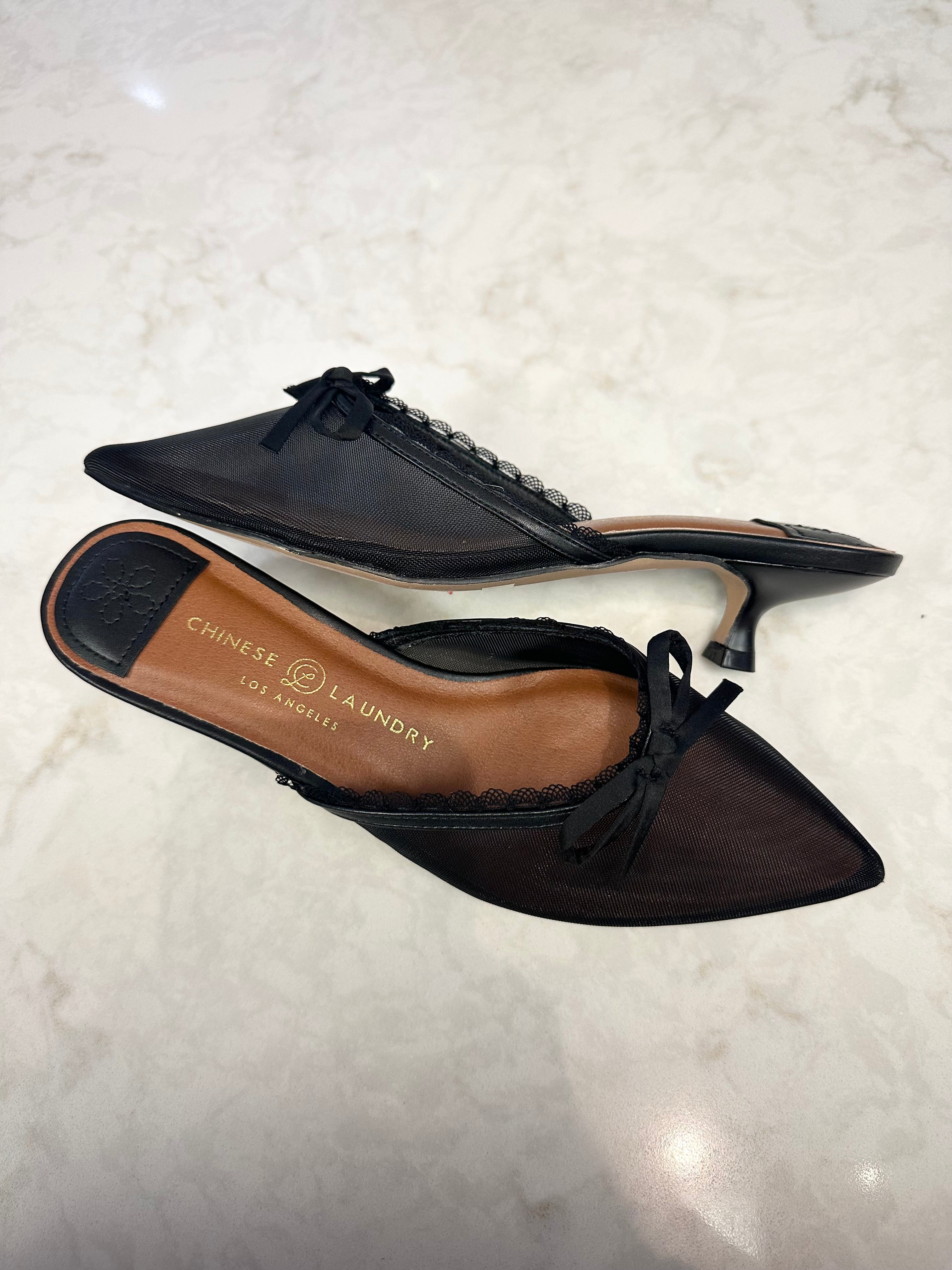 Step into elegance with The Mel Slip-On Heel in black. Featuring a sleek pointed toe, a slender 1.55” stiletto heel, and a delicate sheer mesh vamp accented by a charming bow, this shoe adds just the right touch of bold sophistication. Perfect for pairing with a mini dress and oversized coat, it promises to elevate your night-out ensemble and capture attention effortlessly.