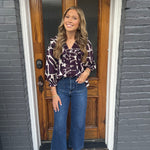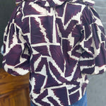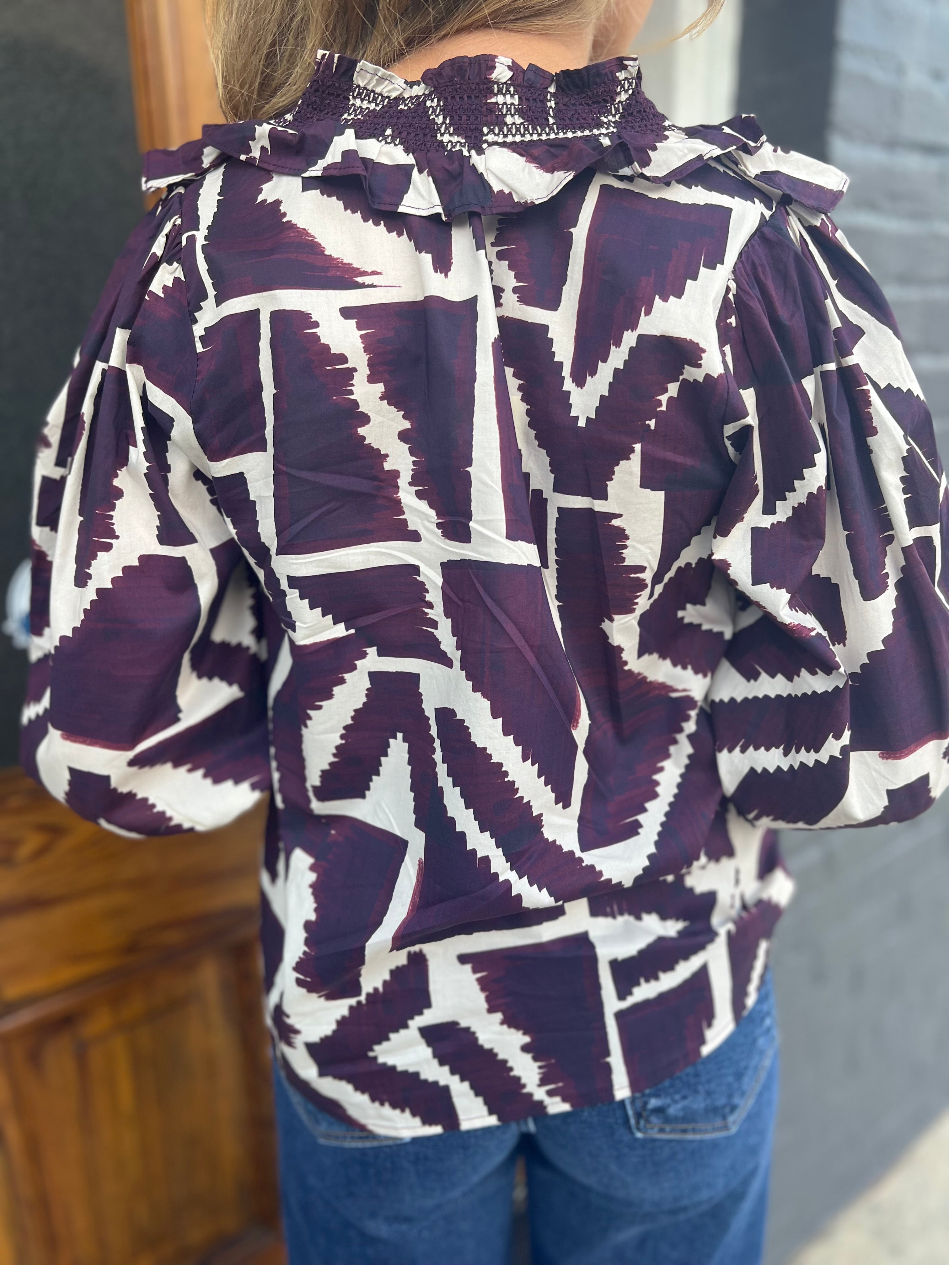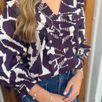 Elevate your wardrobe with THE MERLOT BLOUSE, a printed 3/4 puff sleeve top designed for effortless style. Its ruffle-trimmed V-neck and smocked detailing at the front and cuffs add a flattering, feminine touch. Crafted from lightweight woven fabric, this unlined, non-sheer blouse offers comfortable wear while maintaining a polished look. Perfect for both casual outings and dressier occasions, it blends delicate details with everyday versatility.