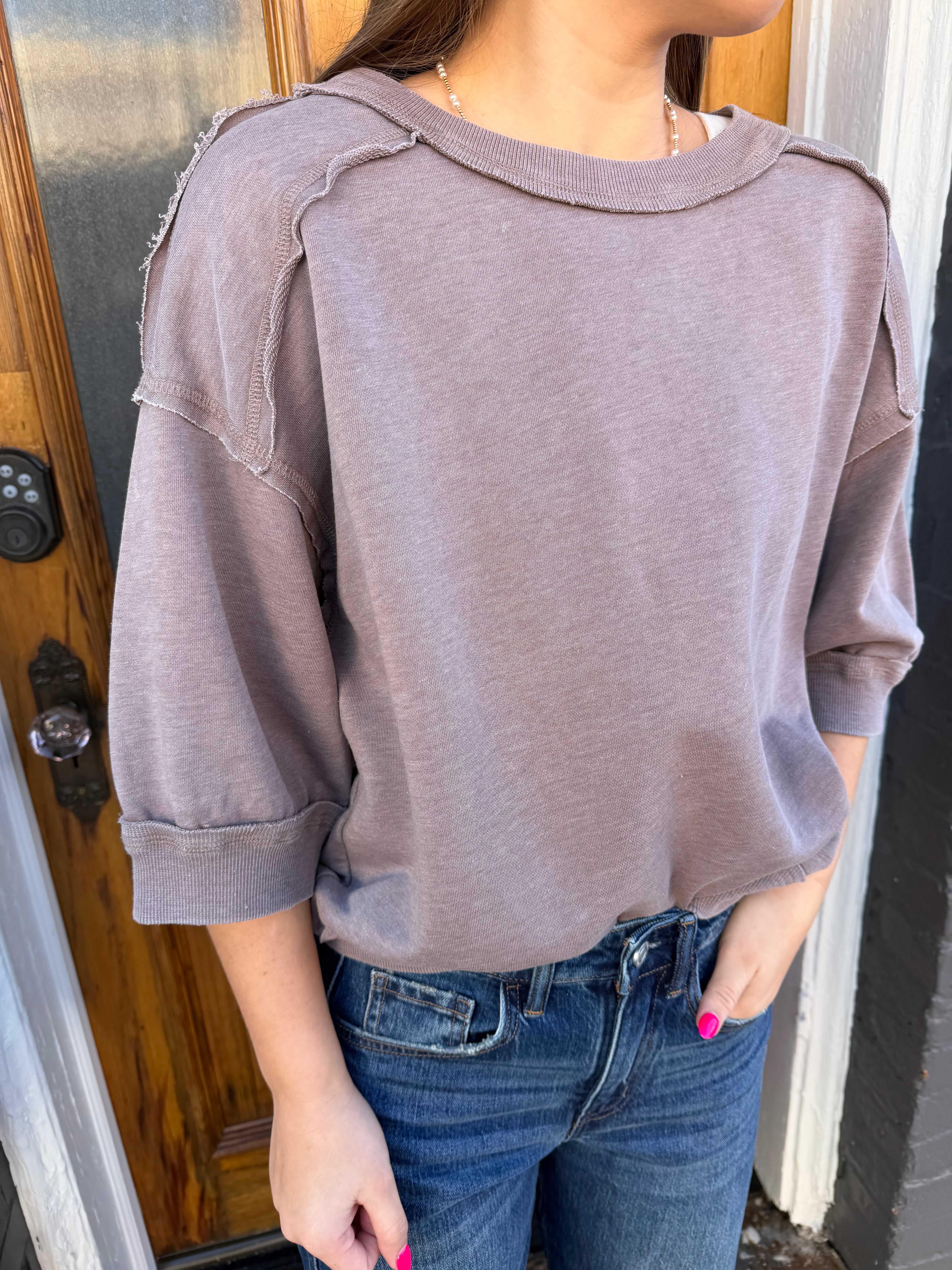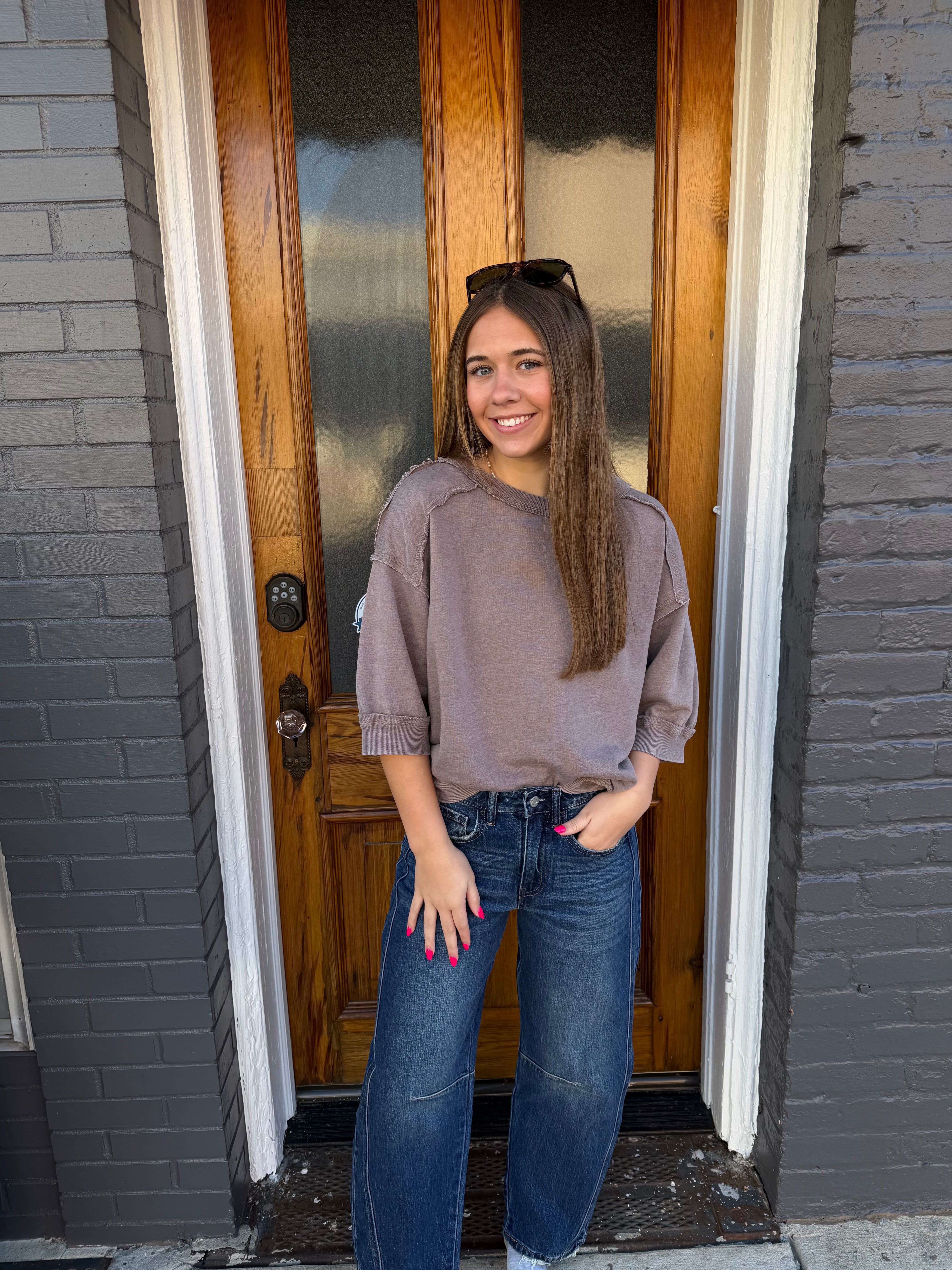 Effortless sophistication starts here. The Penelope Short Sleeve Top in Mocha combines a mineral-washed French terry fabric with a relaxed silhouette that feels as good as it looks. Featuring a deep boat neck, dropped shoulders, and oversized sleeves, this piece delivers that coveted lived-in aesthetic without trying too hard. Raw-edge details and a ribbed hem add subtle texture, while the breathable, lightweight construction keeps you comfortable all day. Perfect for layering or wearing solo, this is the top that makes every outfit feel intentionally cool and undeniably chic.