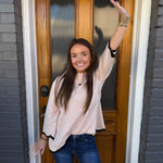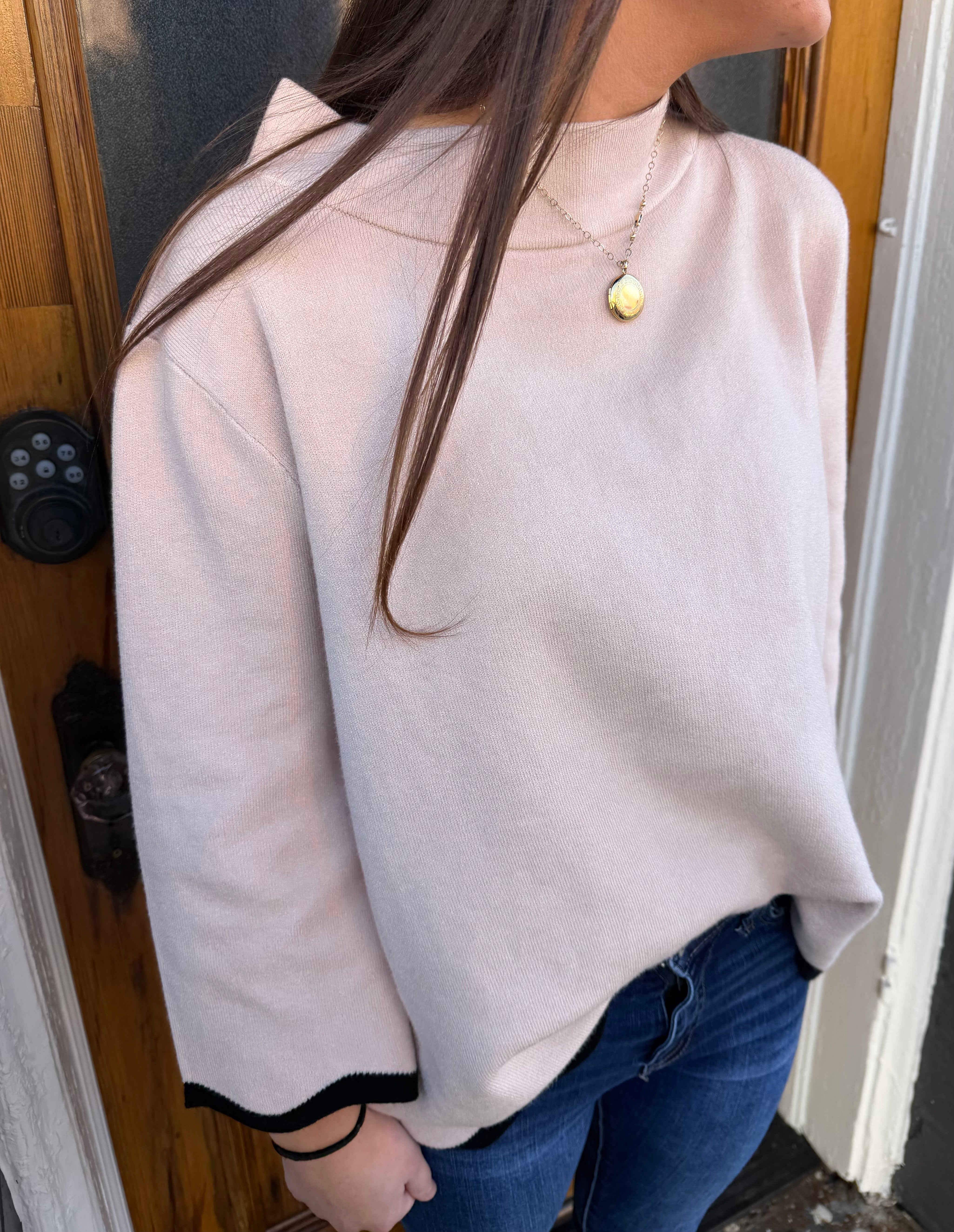The Victoria Sweater in Blush is a charming layering essential that effortlessly elevates your cooler-weather wardrobe. Featuring a sophisticated scallop-edge mock neck and three-quarter length sleeves, this piece combines timeless elegance with modern comfort. The thoughtfully balanced blend of 55% viscose and 45% nylon creates the perfect weight—substantial enough to provide warmth without bulk, while maintaining a graceful drape. Black trim detailing adds a pop of color that brings dimension to your everyday looks. Whether styled solo or layered under your favorite jacket, this versatile sweater delivers both polish and practicality for transitional seasons.