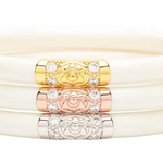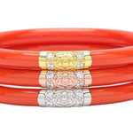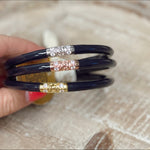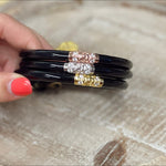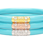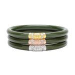BuDhaGirl’s Three Kings All Weather Bangles® (AWB®) - Jade are beautiful orbs that hold all of our extraordinary qualities…they are weightless, soundless, waterproof, and TSA proof while being amazingly glamorous. Available in a set of 3 each in either Jade, Black, Ivory, or Red they look stunning combined with our gold or silver AWB. Jade is an auspicious stone best well known for loving heart energy and purity. Each set has our exclusive Lotus prayer bead in yellow gold, white gold, and rose gold…thus the name Three Kings, paying tribute to the three hues of gold.