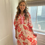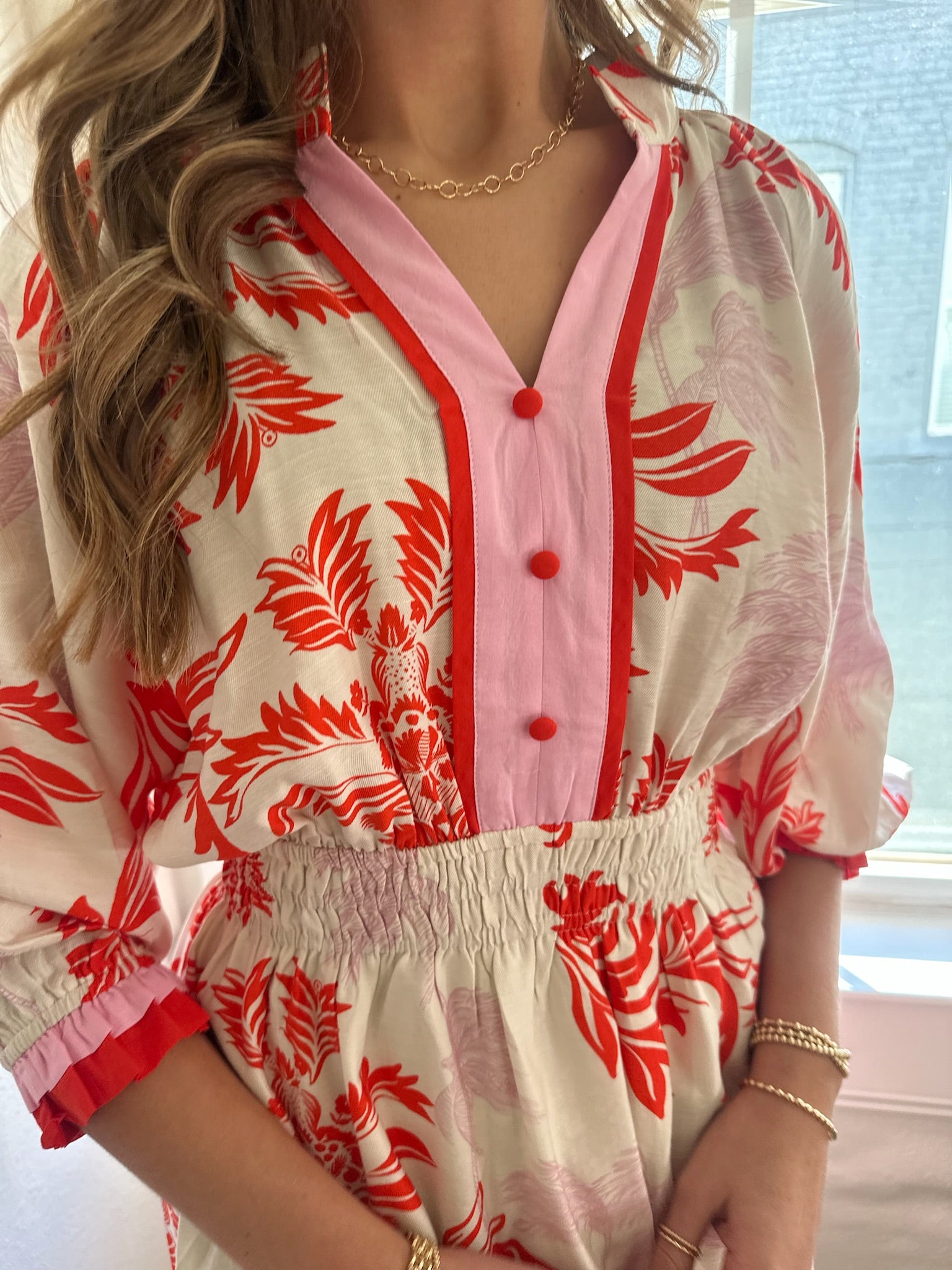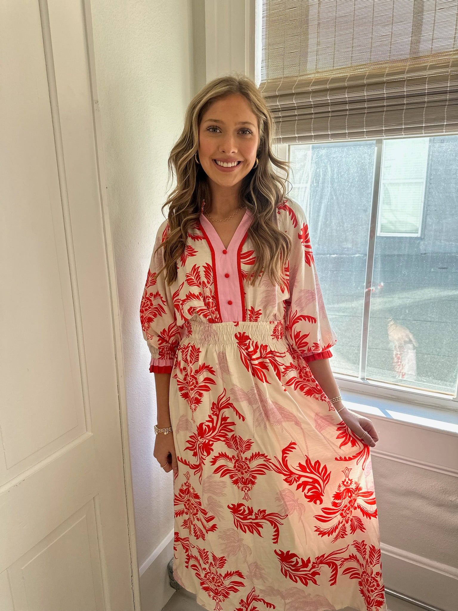 Embrace effortless tropical style with this stunning midi dress featuring a vibrant tomato-red print. The contrast button placket and neckline add sophisticated detail, while 3/4 sleeves with charming ruffle-trim cuffs offer a playful touch. A smocked elastic waistline ensures a flattering fit, flowing into a lined midi skirt with graceful movement. Perfect for warm-weather occasions, this dress combines comfort with eye-catching design for a look that turns heads wherever you go.