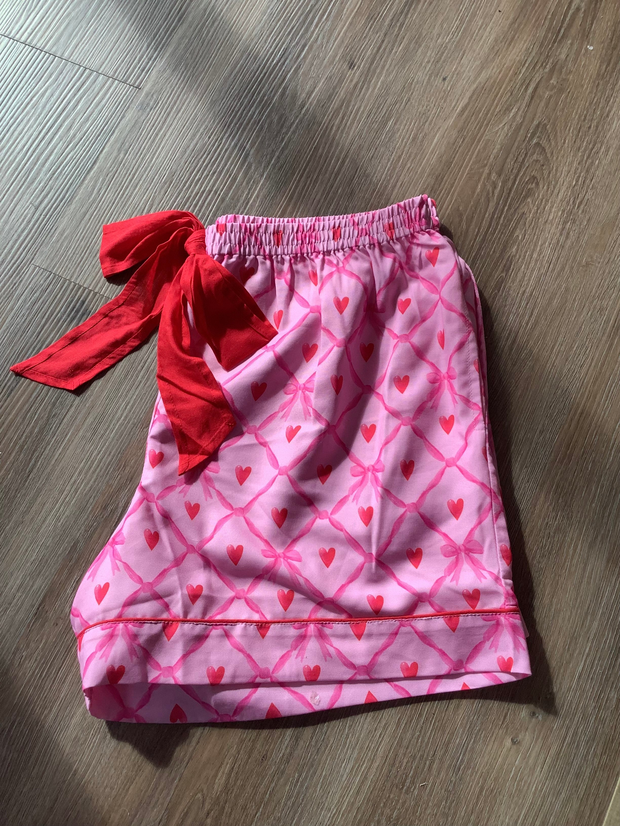 Embrace cozy charm with these Valentine Pajama Shorts in pink. Crafted from soft polyester, they feature a flattering bow tie at the waist, elegant piping details, and convenient side pockets. The playful red heart pattern adds a touch of romance, while the comfortable 3 3/4" inseam ensures an easy fit. Perfect for lounging or a sweet night in, these shorts combine comfort and festive style effortlessly.